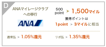 リボ払いで、1000円=4.5×3=13.5マイル(還元率1.35%)です。